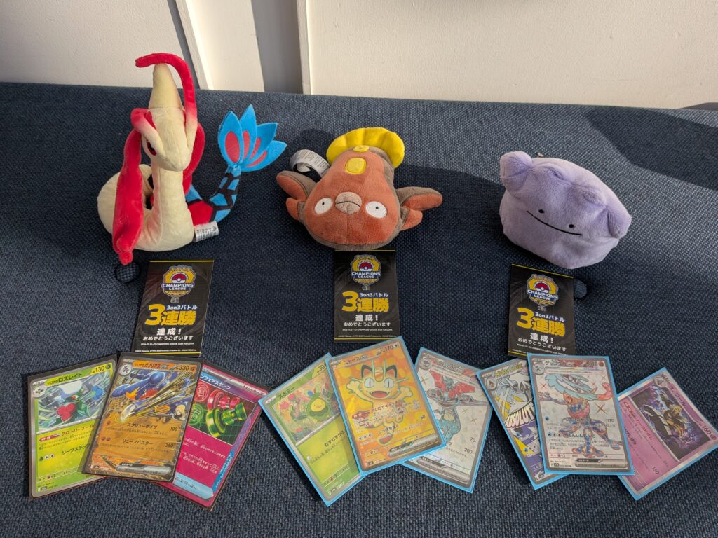 本戦は終わりましたが、まだまだポケカを楽しみます。 サイドイベントの「3on3バトル」では、地元でいつも切磋琢磨している仲間とチームを組んで参戦!息の合ったプレイで見事3連勝を達成し、本戦の悔しさを最高の笑顔で塗り替えることができました。